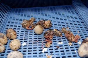 Two lives have ended but we have plenty of new life here, the Quail caught me by surprise on Sunday morning as I had not expected them to hatch until tomorrow. In total 34 have hatched so far, that’s pretty good, they are tiny little things and I had to quickly get the brooder box sorted out, normally chicks go out into a box in the stable with a lamp but these are so small we made a special one that can stay indoors, it is made of a plastic storage box with a red bulb screwed to the inside, it means that we can keep them indoors and has the added bonus of being able to watch and observe them. They wriggle about like a tub of worms, each one trying to get nearest the warm spot. I have taken a couple of pictures, one is of them in the brooder box and the other is of little ones that have just hatched, they stay in the incubator until their feathers dry out then they are moved in with the others.