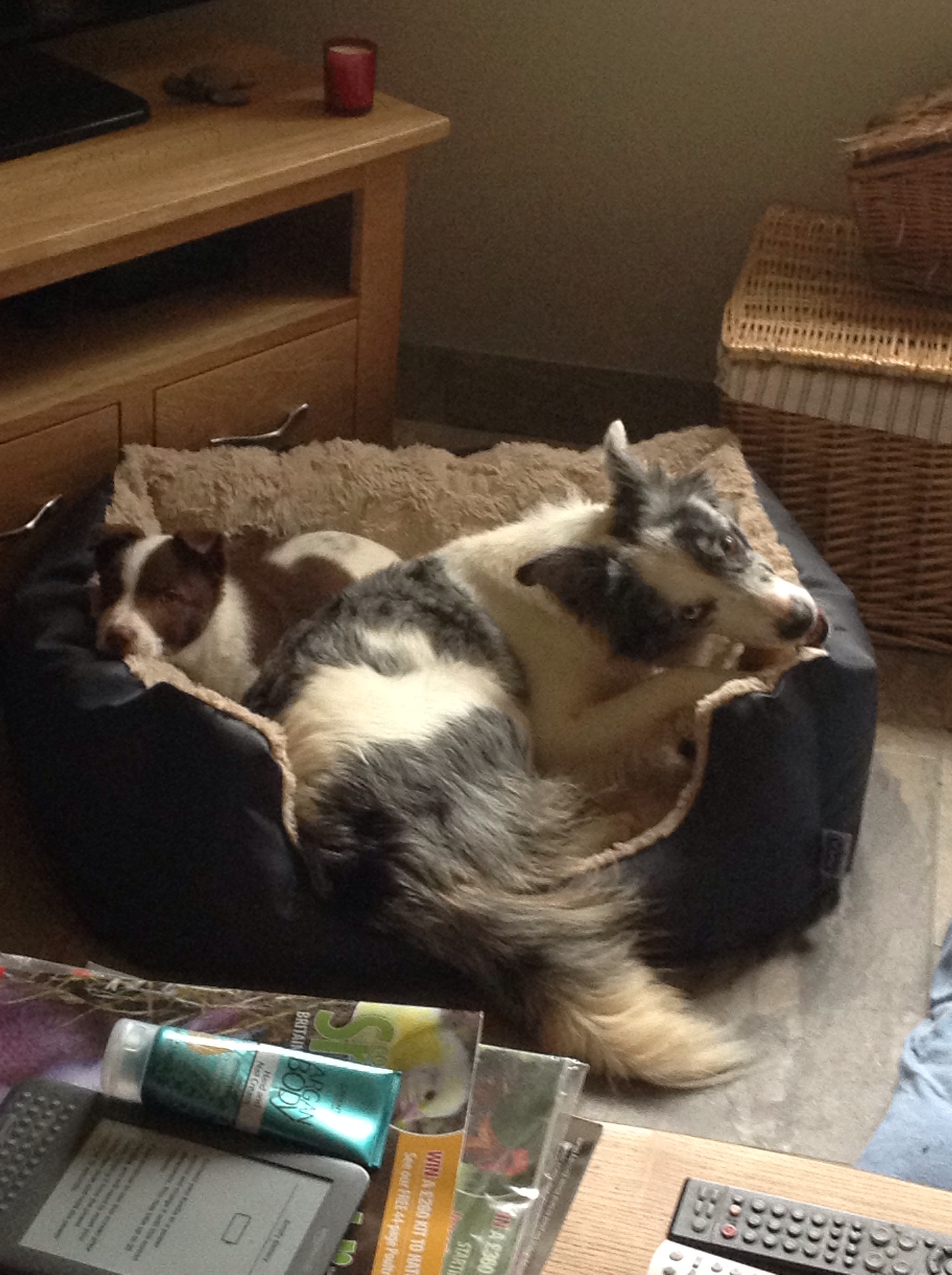 It may not entirely surprise you to know that we ended up with one of the puppies after all, so I will introduce you to the newest farm dog, Patch, as you can see from the photo, Mia is thrilled to bits to have someone share her bed with lol