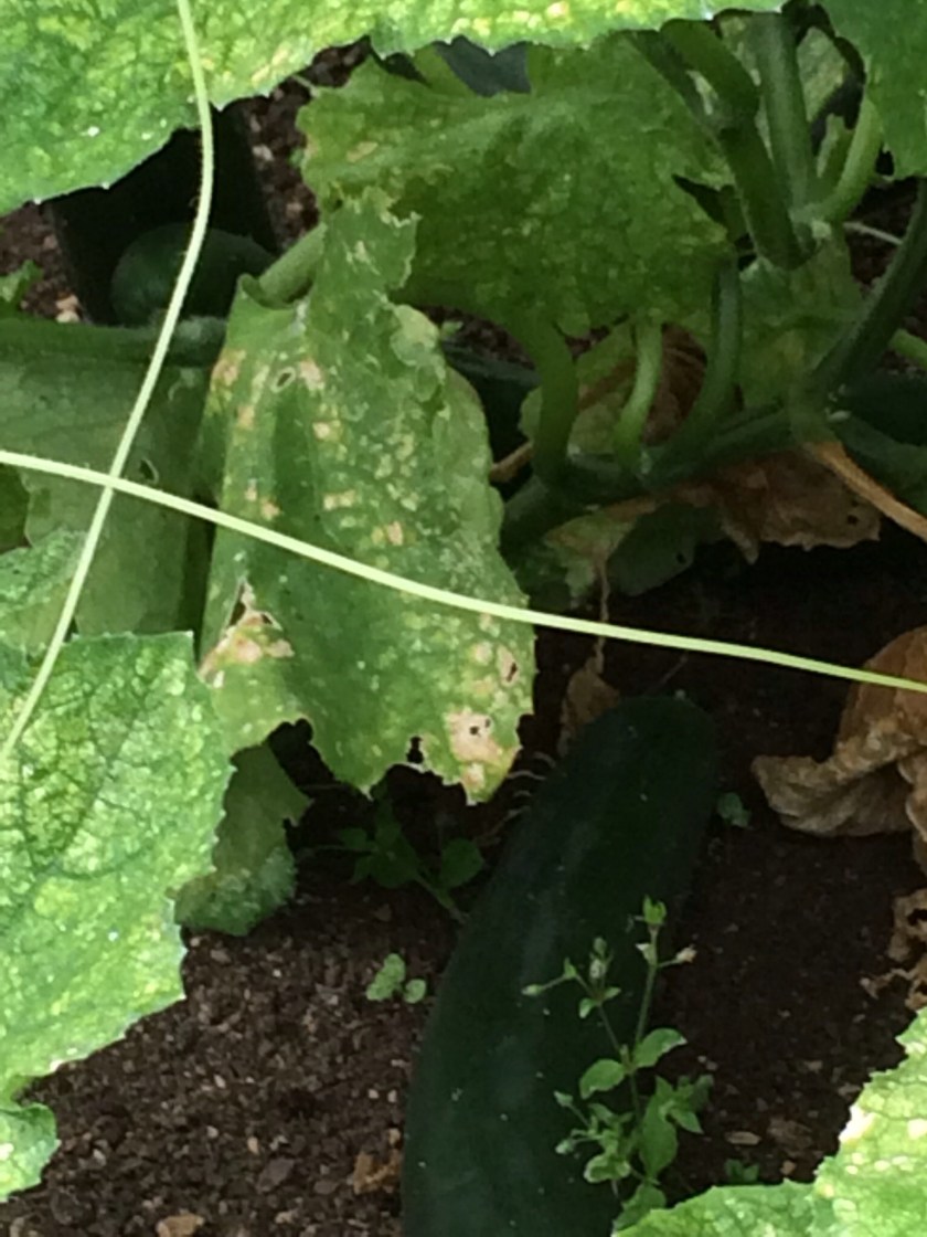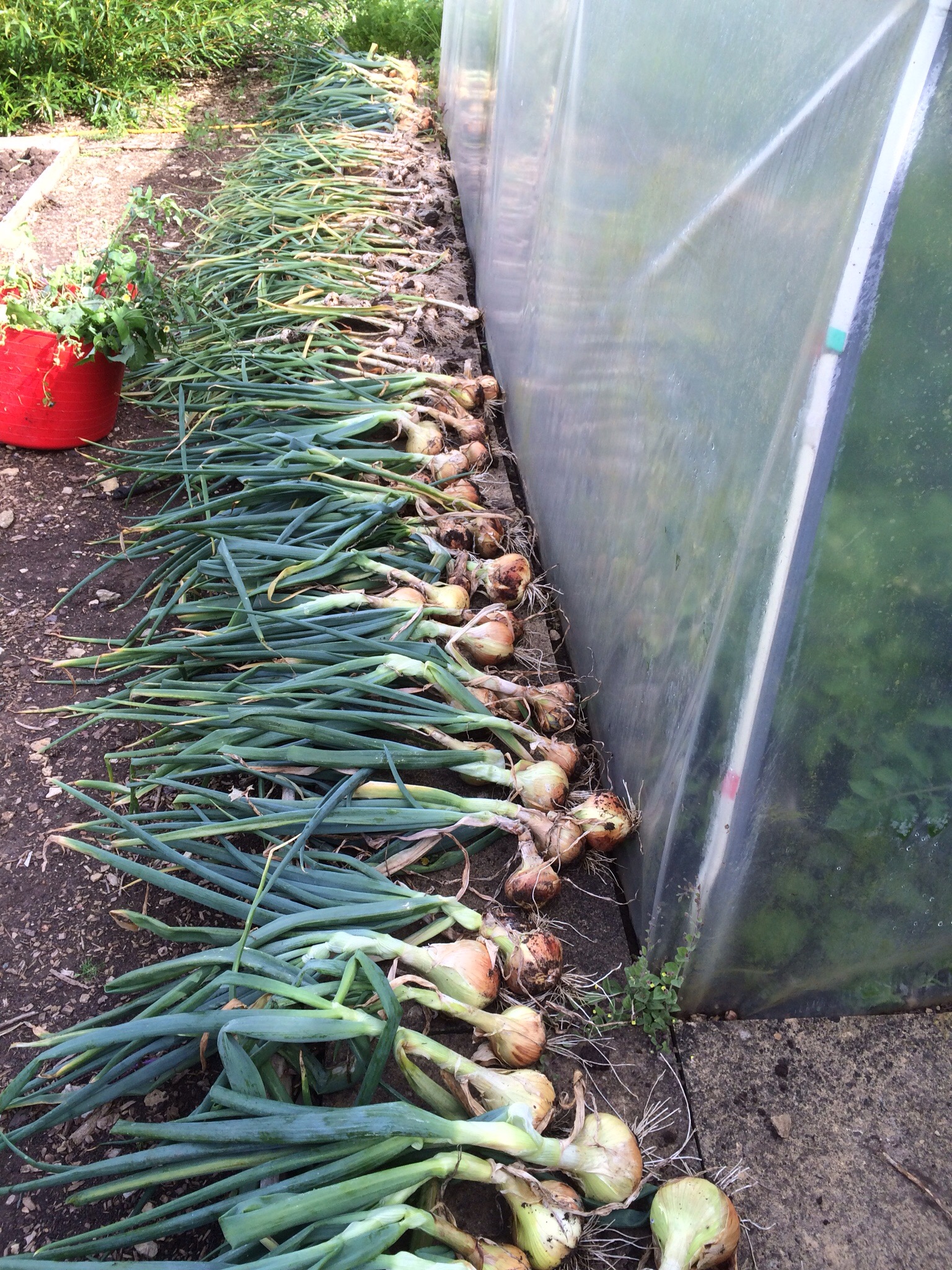 Meanwhile, apart from helping him now and again, I have been picking produce and getting it ready for storage or sale. I have had a bumper crop of onions and garlic, they are now drying nicely in the greenhouse. I decided to have a go at plaiting the garlic, how hard can it be after all I do have three daughters and so plaiting hair was second nature when they were younger, turns out it’s not quite so easy to do it with garlic! I have made a bit of an effort but I think the French would laugh me out of the garlic store, it will be ok for hanging in the back room ready for use over the next few months. Cucumbers are growing thick and fast, I keep thinking I really only need to plant one but always end up planting about four, consequently I have an abundance of them as they seem to grow really well here, they won’t be wasted though, If I don’t sell them or eat them them the chickens will be very glad of them. The tomatoes are just beginning to ripen at long last and I can just see peppers beginning to form, they may produce something larger if the weather stays warm enough. Of the new produce I experimented with this year the cucamelon that I decided to try turn out to be a bit of a waste of time, they are tiny and I mean tiny, about the size of a grain of rice lol, the samphire never even materialised but the Water Melons, oh my, they are a different story all together, at the minute they are the size of a small football and growing by the day, I can’t wait to try them and hope they live up to expectations.