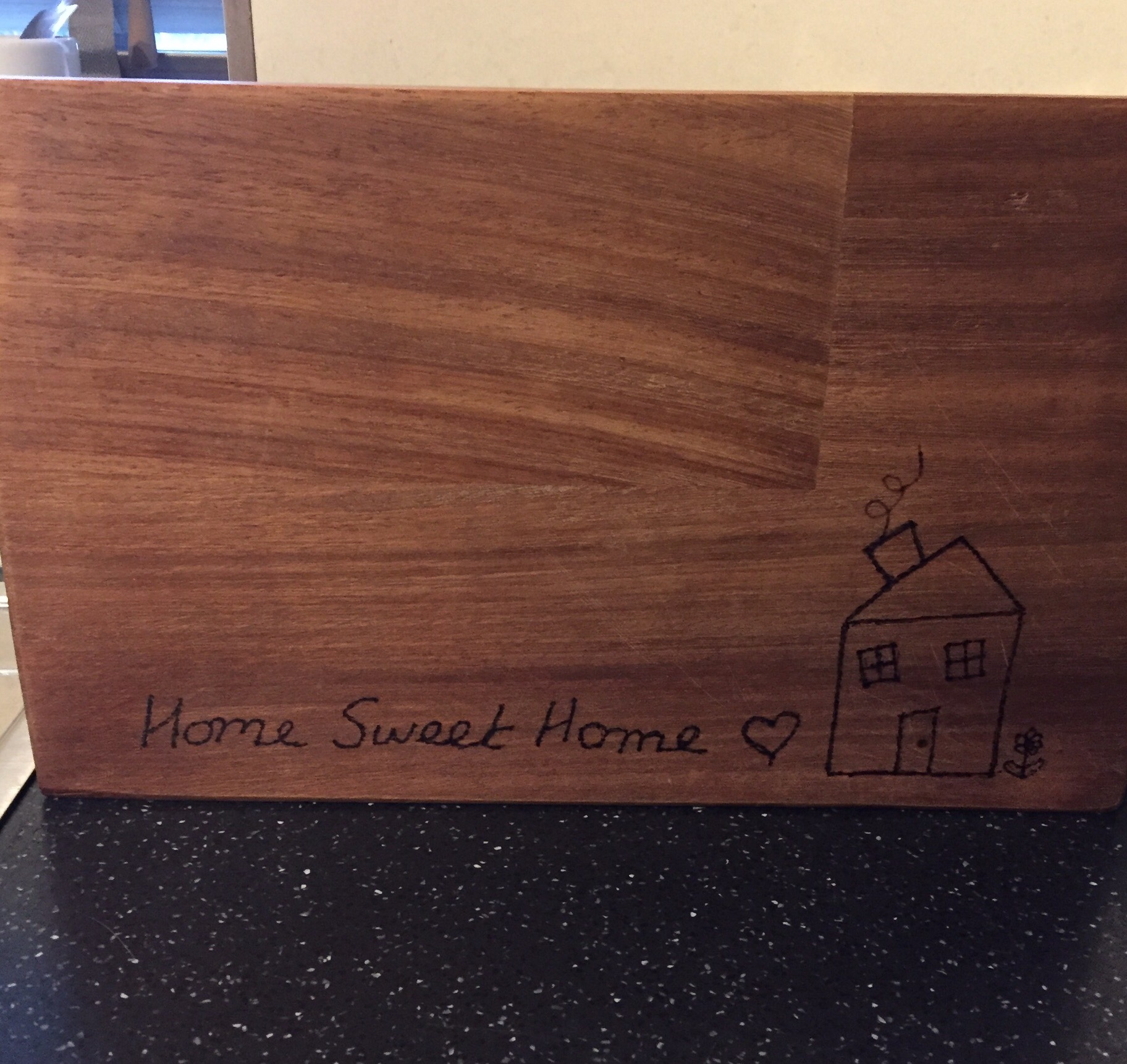 I did have some other things on the list that I didn’t get round to but there is always tomorrow besides I wanted to try out my new gadget, a wood burning pen/stick thingy. I had a spare chopping board lurking around and wanted to have a go and give it to Charlie and Macca for their new home, I was pleased with the results 😀