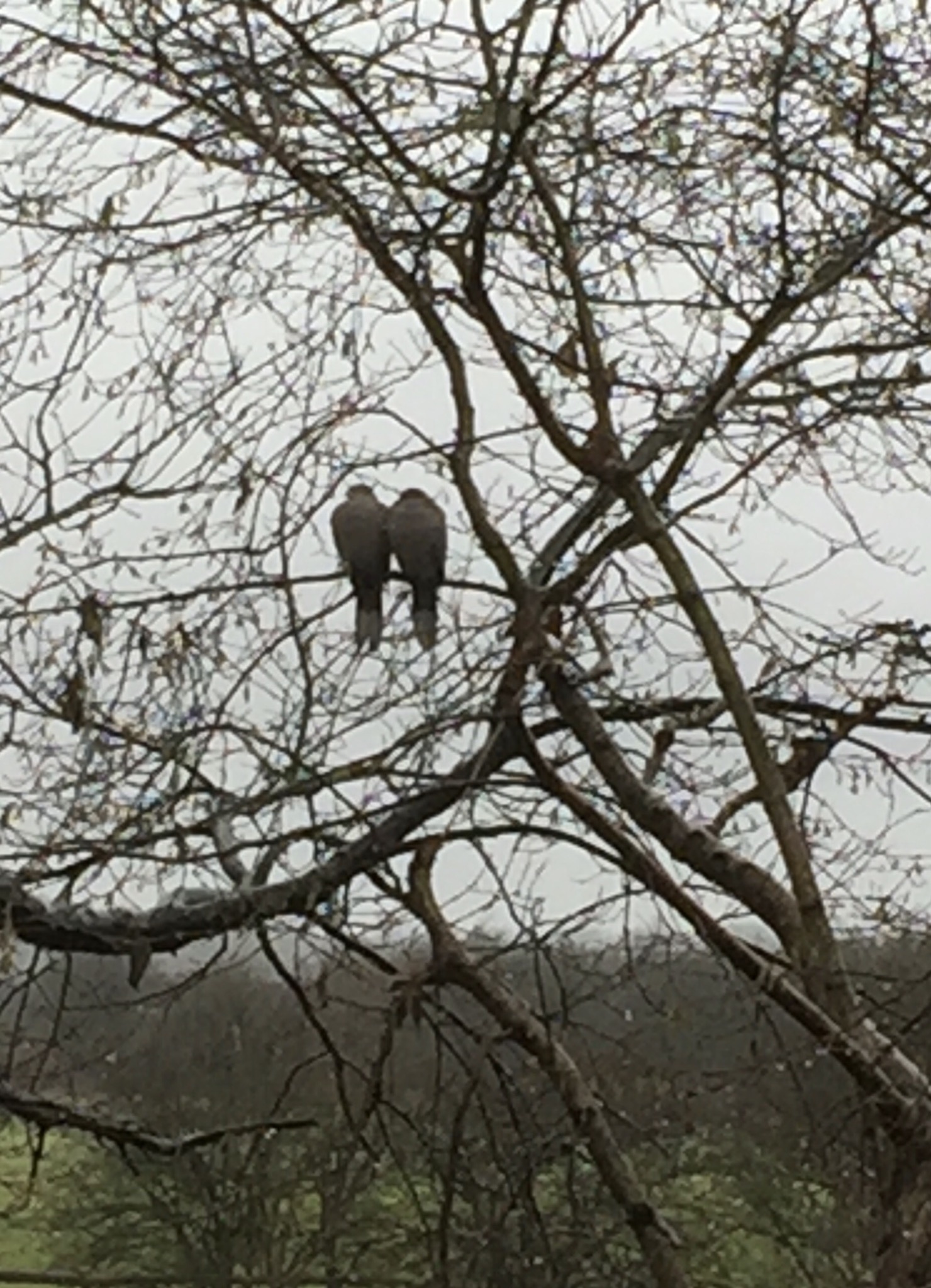 Took a photo of two doves that have been hunkered down for about an hour in the tree outside the back door, I wonder if they know what the weather has in store?