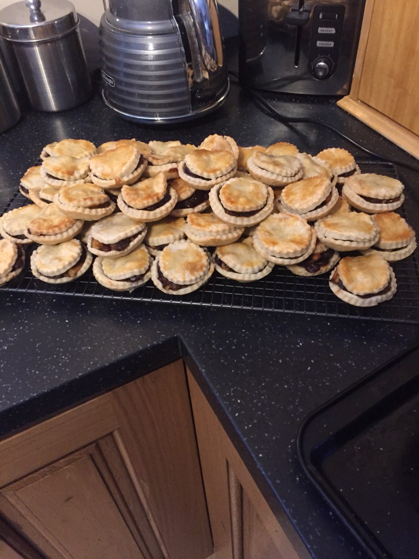 Then I did a mammoth session in the kitchen, 4 dozen mince pies, give or take one or two for quality control purposes 😝 most will be frozen otherwise they won’t last long with John around! Two pork pies, I followed the recipe and it was not too hard but I didn’t seem to have enough pastry for all the meat mix I had so I quickly made more pastry, they are still cooking at the moment and the trotters are on the Rayburn hopefully making the gelatine that will go inside when they are cooled. I have no idea how they are going to taste or turn out but I wanted to try. I also made bread while I was at it and both ovens were going flat out in a round robin of things in and things out. The lamb from yesterday is back on in the slow cooker and smells amazing today.