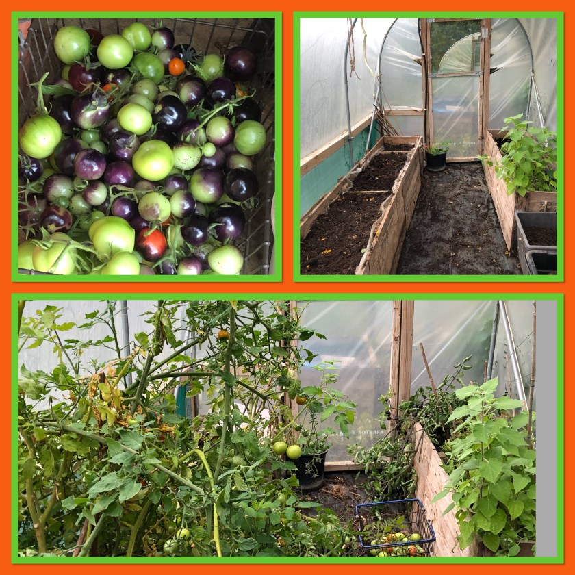 After that is when it began to rain so I tackled the small poly tunnel, Monty Don says the tomatoes won’t ripen anymore and I am inclined to agree with him, so I picked all the remaining tomatoes, green and ripe ones and cleared the plants from the tunnel. I have put the basketful in the shed as he says they may ripen in the dark, I’ll give it a go and if they don’t it’s green tomato chutney time π I put in a top dressing of fresh compost and planted the left side with garlic bulbs, the two small tubs I have sown some giant winter spinach and hopefully they will all grow well. I did notice some mouse activity in there, clusters of eaten hazelnuts and tell tale holes so I have set the mousetrap π I don’t want the garlic bulbs all eaten before they get going.