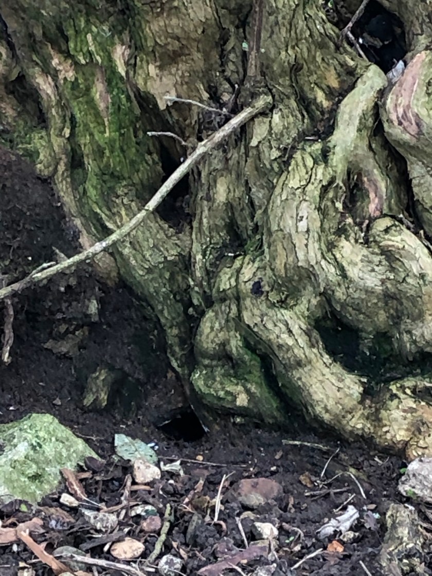 While I was out with the bonfire I noticed two little holes in the bottom of one of the buddleia bushes, if you look closely at the phot you can just about see them. I think this is a mouse home as the cat was pretty interested in the activity under the piles of sticks when they were there, they could be vole I suppose, I would have to sit and wait to see what came out of them to be sure. These bushes were planted way back in the seventies and have done really well to survive this long, the trunks are beautifully gnarly.
