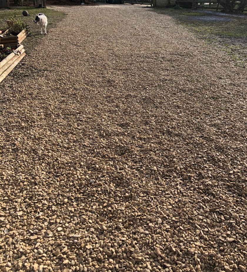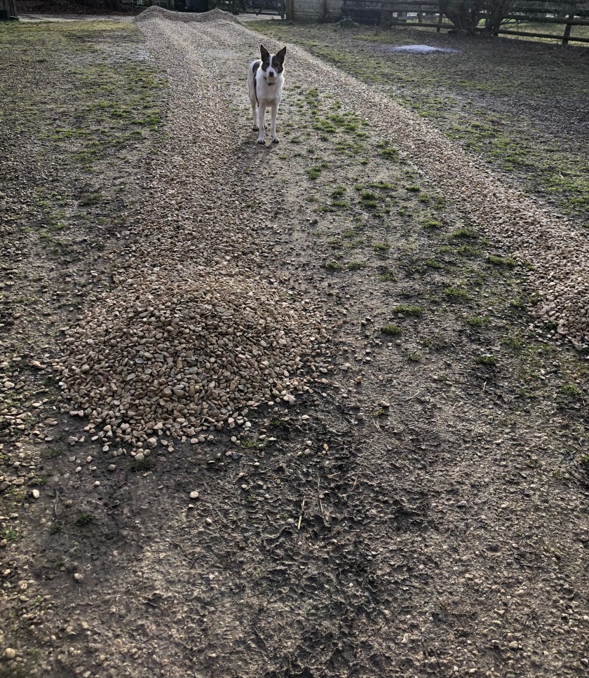 Again, another nice morning, sorry for being so negative February 😜 The shingle arrived this morning, it was supposed to come yesterday and John came home early to shovel it but after phoning the supplier they had forgotten 🙄 It arrived before 8.30 this morning so after doing the rounds I set about shifting it to where it needed to go. The driver was pretty helpful trying to drive and tip it at the same time but most of it ended up as far away from where it needed to go as was possible 😂 So cue Dawn, a shovel and a wheel barrow to spread it around, I did a pretty good job I reckon though I think we could have done with more than the three ton. The dog in the photo, Patch, although he looked as though he was ready and willing was absolutely no help whatsoever 😬