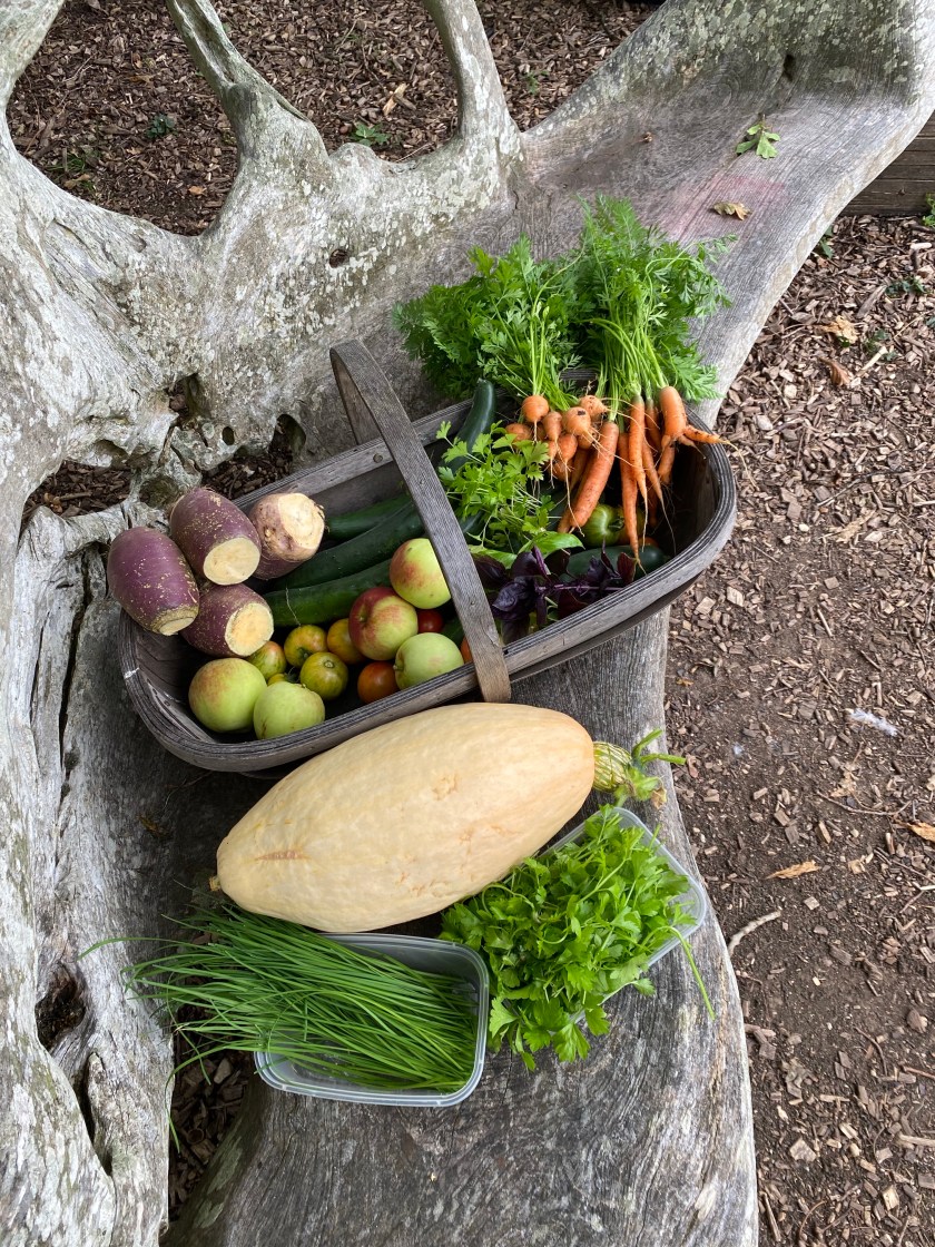 Friday: Started of with the same weather as the last couple of weeks, grey, overcast and a tad cold but the sun came out at lunchtime 😁 I did a fair bit of picking to begin the day which included a good load of plums, the Victoria’s on closer inspection seem to be mostly good, I also picked greengage and damsons. I tidied the kitchen and planned to make jam or chutney etc but the postman arrived with some plants and as I have a busy couple of days ahead I thought I better get them in the ground. They are kale plants, I didn’t sow seed in time and so had to order 10 plants, 5 different types so it will be interesting to see what they all taste like. Then as I was out there I decided to organise another raised bed and plant up some bulbs (allium of various types, tulips, and ranunculus) phlox, geum and knapweed, these are the first of my planting for cut flowers next spring. I dug up a few other small plants ready to divide, they are resting in a bucket of water for the time being as the sun was a bit too strong for me to stay out (Sod’s law 😂)