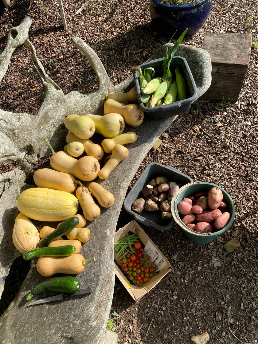Sunday afternoon: thought I would just add this in as I did do a bit in the afternoon, I hadn’t intended to but John said it was going to rain and be really windy 🙄 I thought, in that case I had better do a bit of picking while it was sunny and dry and then anything spoilable will be saved. I picked butternut squash as all the foliage has now died back, some are very small but they will still feed us and so I won’t waste them. I picked the rest of the sweetcorn, some dwarf beans, swede, courgettes, tomatoes and then I dug up a bed of potatoes as that foliage has died back to. I then had a look on my weather app to see exactly when the rain was coming, no sign of it at all on my app, I said to John it doesn’t say anything about rain, oh I thought I heard it he said, note to self, check facts don’t just rely on Johns say so 😂 I had been very relaxed and for a change my hands were nice and clean until then!