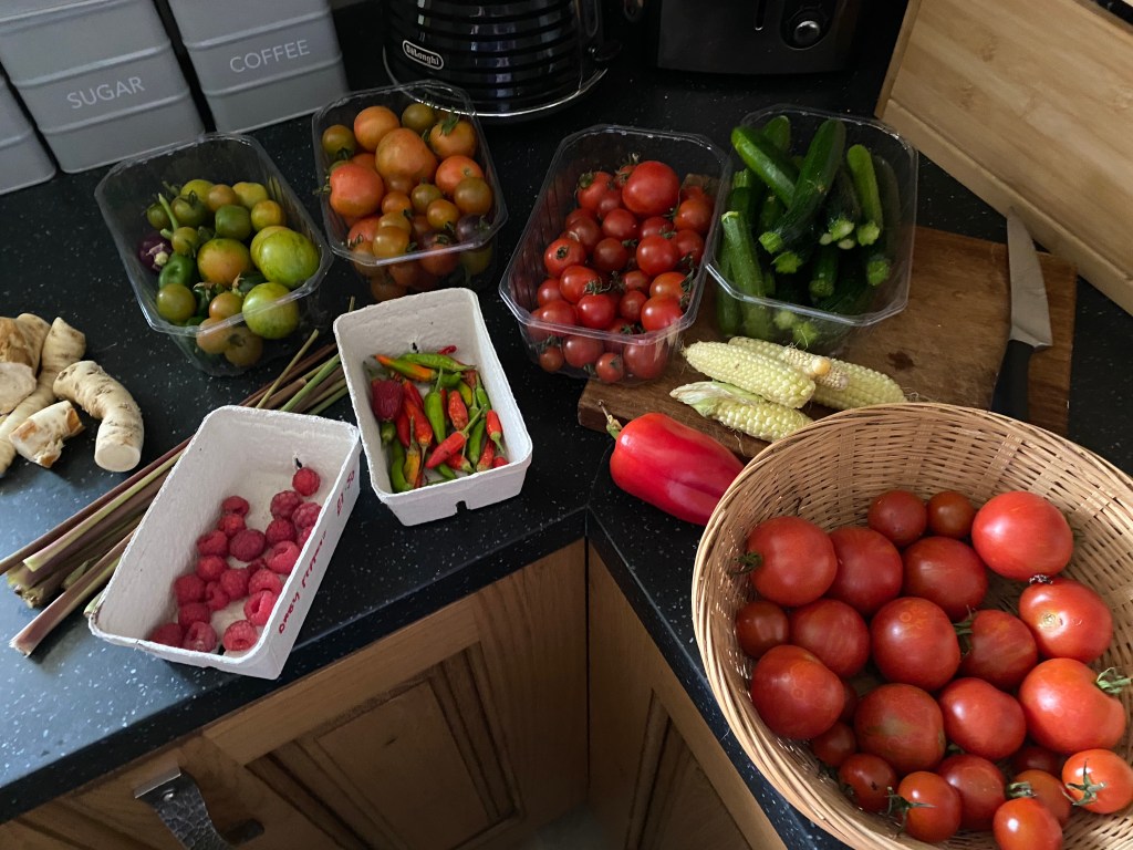 Wednesday: Another good lot of work in the garden today although I did sit down at 1.30 for a good hour or so, the more I do the more tired I feel the next day 🙄 But I feel like I am really getting somewhere and making good progress with the preparation which in turn will make next spring a lot easier hopefully. I started off in the greenhouse picking any remaining chillies and peppers then putting the plants outside, they will go in the compost bin when there is room. I cut all the lemon grass, took the tops to the rabbit and Guineas and kept the rest of the stems, some are for sale some I will find a use for. I also took one of the plants inside to overwinter along with another ginger plant. I dug up part of the horseradish, it has got huge and I don’t want it taking over, some of the root I put out for sale the rest I will grate and freeze. Next I fixed the side of one of the long beds, the wood had rotted and the side collapsed and then onto a fair amount of weeding. I picked all the remaining courgettes, they are small but still useable. All the while I was popping back and forth to the kitchen because I was baking bread. While I was waiting for the bread to cook I made a batch of tomato soup all with home grown ingredients, garlic, carrot, basil, tomatoes and a lovely red pepper. Back outside to get some more bits done before moving 4 barrows of woodchip. I think I earned the sit down lol.