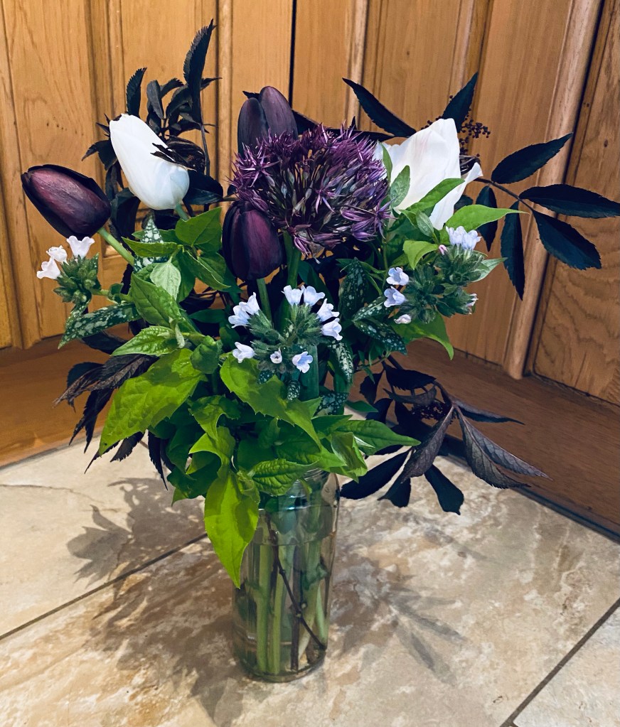Dark purple and white tulips, an allium and some pale blue Jerusalem cowslips together with mock orange foliage and some sambucus nigra make a winning combo 🥰