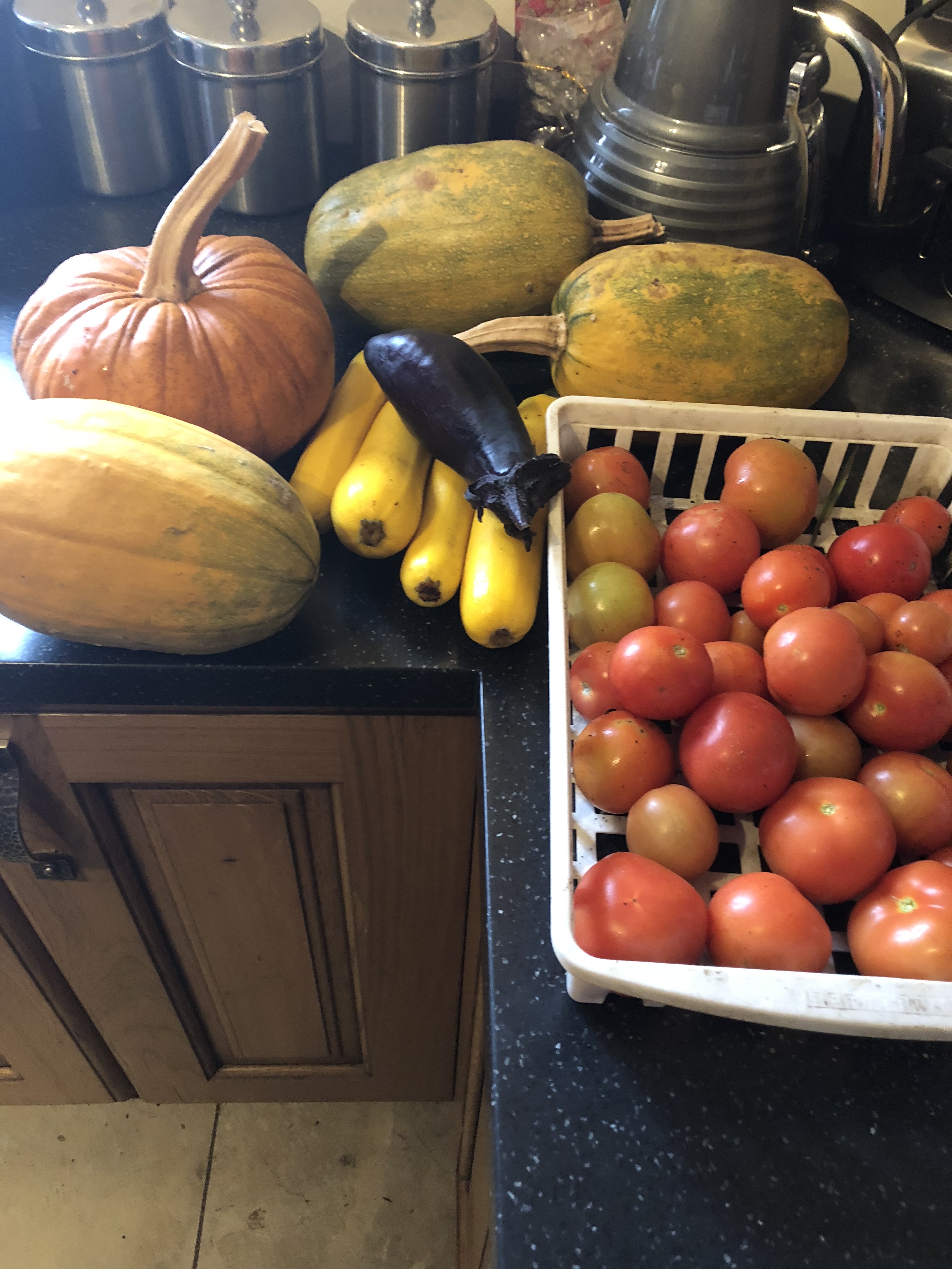 I wanted to let the ducks out of the duck pen to forage around under the crab apple tree but I needed to secure a few areas into the veg garden first to make sure they don’t get in there, the veg garden will be for the orchard ducks when I have finished harvesting everything. After that I set about harvesting some of the veg that needed picking, butternut squash, courgettes, some tomatoes, spaghetti squash and a token aubergine! I always have trouble growing aubergine and this year was no different really, I keep trying but for some reason they don’t like it here, except for one plant which is thriving, in fact it’s still flowering, I have only had two fruits from it mind you.