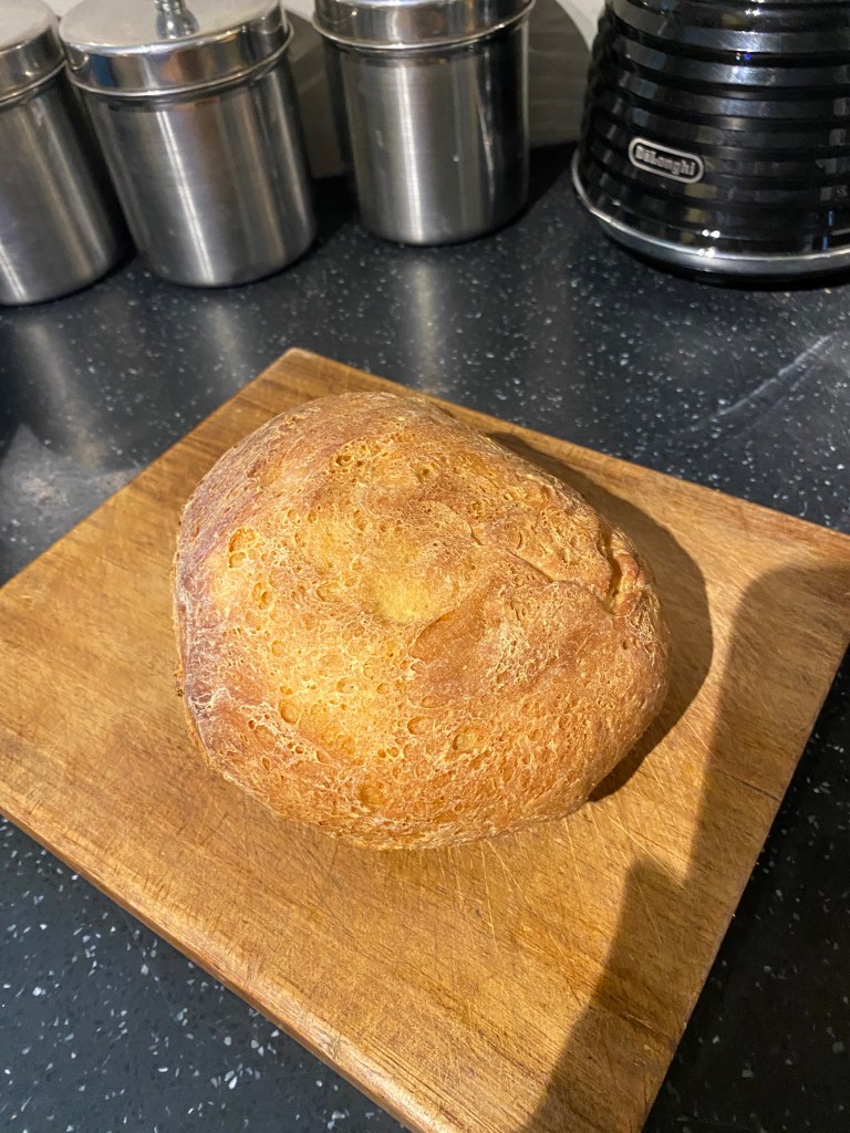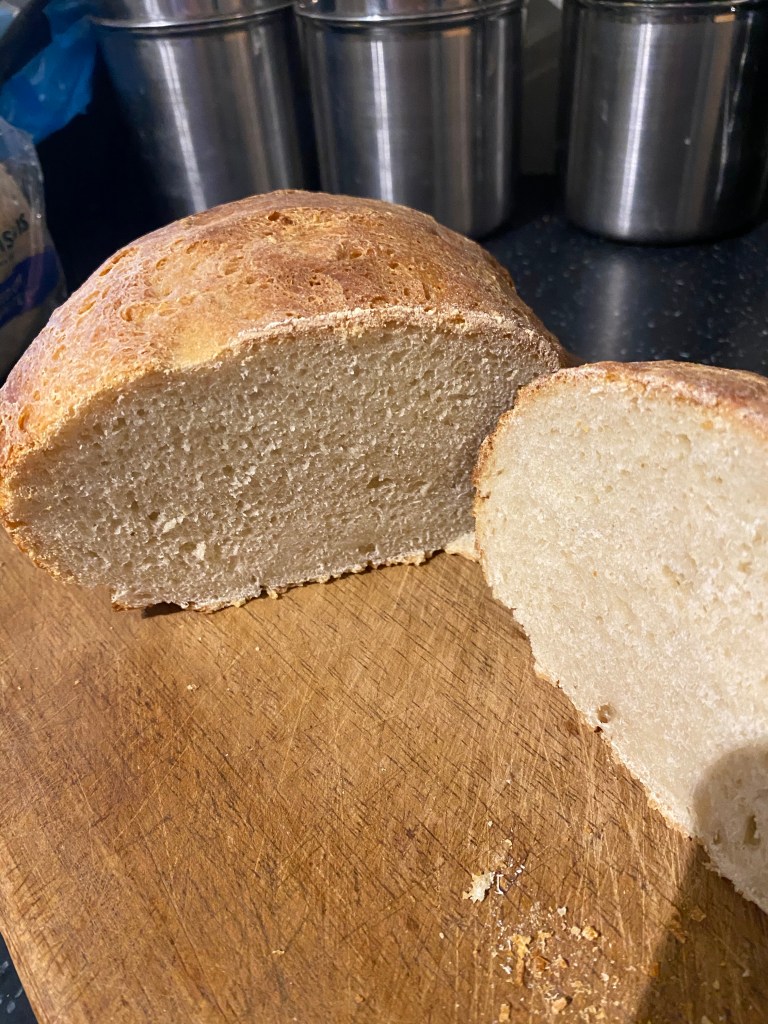 The sourdough starter seemed to have a life of its own overnight, it grew so much that it leaked out of the sides, that’s a good thing 😀 I guess it was due to the heat from the Rayburn in the kitchen as this morning it has calmed back down again although it still has life (bubbles) so I have fed it again. The sourdough dough I had in a bowl which didn’t seem to rise was showing signs of activity this morning so I baked it to see how it came out. I can tell you that if I was about to attack a local castle keep I would consider using it in the catapult 😂 it’s a bit solid, however I cut it and it smells like sourdough though heavy in structure, I tasted it and it has that sour taste so I’d say it’s about 70% successful, just need to improve on the technique now.