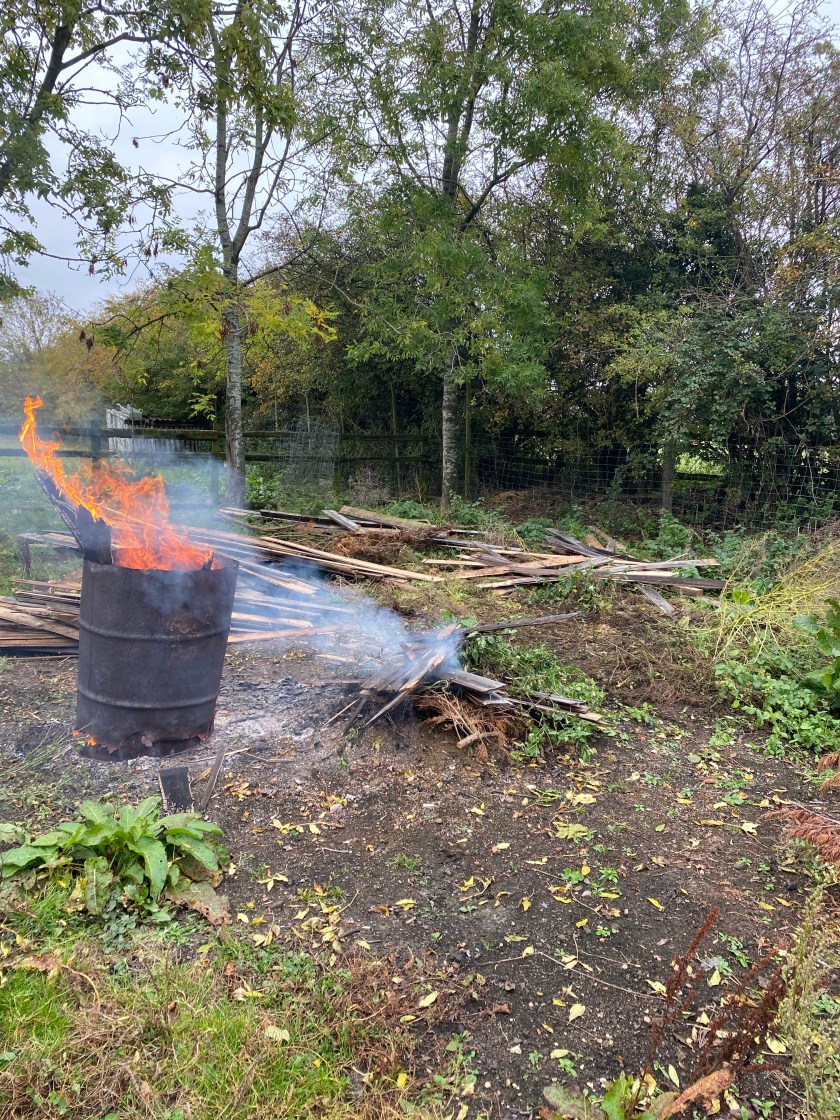 Sunday: Man o man I am knackered 😜 I have spent all day from about 9 this morning, it’s now 4pm, burning wood 🙄 The cladding that came off the front of the building needed burning so that was today’s job, there were a few branches from some trees that had been there a while as well. First I had to sort through the pile as it all just got dumped there, there was a pile of painted stuff that needs to go in the skip, a pile of wood that was ok and would come in handy at some point and a pile of gravel boards. I then sorted the wood into smaller and longer bits, the smaller bits I started off in the burning barrel but about two hours in the side started to give so then I started a pile on the ground. The reason I didn’t do this in the first place was the wood was too close to where I would be burning and I like a controlled burn, John, like most men I suspect, would have just had a twenty foot pile of wood and set fire to it 😜 Also he would not have thought about the insects and any small animals that might be under the wood whereas I do so if I move it then they have a chance of getting away first. In fact I was stood there and a little mouse came creeping out of the ground, saw the fire and high tailed away elsewhere 🐭 Meanwhile John was busy creating next weeks burning load, he has given the hedge, where we had the trees cut down, a good pruning both the top and the sides as the branches had got long and straggly. Come spring they should bush out really well as well as grow higher, they have good big roots on them so that will help.
