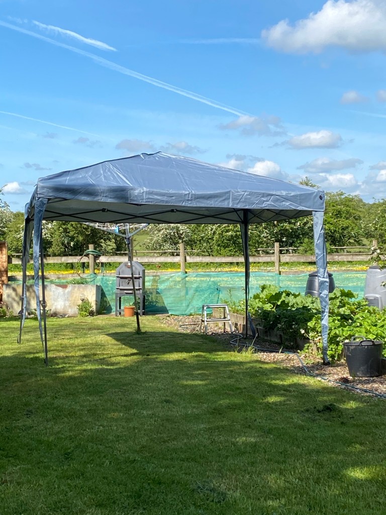 Thursday: Oh what a lovely morning, wall to wall blue skies first thing and warm sunshine 🌞 John had a couple of hours work to do after he had done the birds and I went almost straight out into the garden. First off I have covered some more bare soil with weed membrane, I intend to plant the sweetcorn there but until I do I don’t want hundreds of weeds popping up all over the place. I watered the plants in the greenhouse hopefully they will get some warmth today and shoot up a bit more, it mostly peppers, chillies and aubergine left in there apart from some smaller squash plants that are just coming on. Then I opened a package that had arrived about four weeks ago and I hadn’t had chance to use it but oh my it’s a game changer for me. I don’t know why I didn’t buy one years ago, it’s a UV pop up gazebo and today I have spent 3 hours on my hands and knees weeding in the sunshine and get this bit, in a short sleeve t-shirt which is unheard of! I had the best three hours lol, the only problem with it is that I can’t easily move it to a new area by myself, today John was around but in future I will need to plan a lot better to maximise the use I can get out of it.