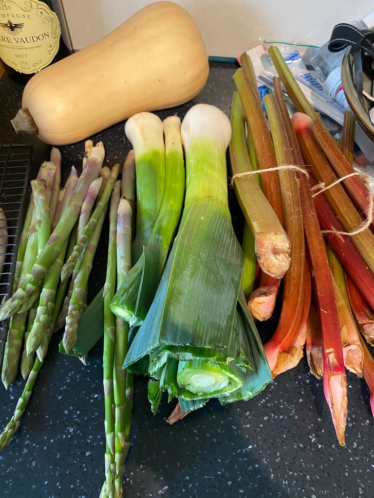 I picked some asparagus spears in the afternoon, I had spotted them earlier when I was planting courgettes and thought, I need to pick those. They grow at a great rate of knots and if you miss them they become a fern, we also have asparagus beetle here and so picking the spears is a good way to knock back the numbers. The beetles lay little tiny eggs on the spear stems but they can easily be wiped off with your finger, no harm done, to the asparagus at any rate 🙄 I dug up a few leeks earlier, they have been in the ground all year and need to come out before they spoil. I often use leeks in place of onion, no point going to buy onions when I have leeks to use up. On the side in the kitchen I now have leeks, asparagus, rhubarb, lettuce and the acquired butternut squash, I need to figure out what I am going to do with it all. I think the asparagus will be a side dish for dinner later, I may cook it and stir it into my rice dish while John can have it with his chop and potatoes. The lettuce can go into salad which I will have with the rice and a chop, I can also use some more of the peppers I also acquired, that leaves the rhubarb the leeks and the squash to sort out.