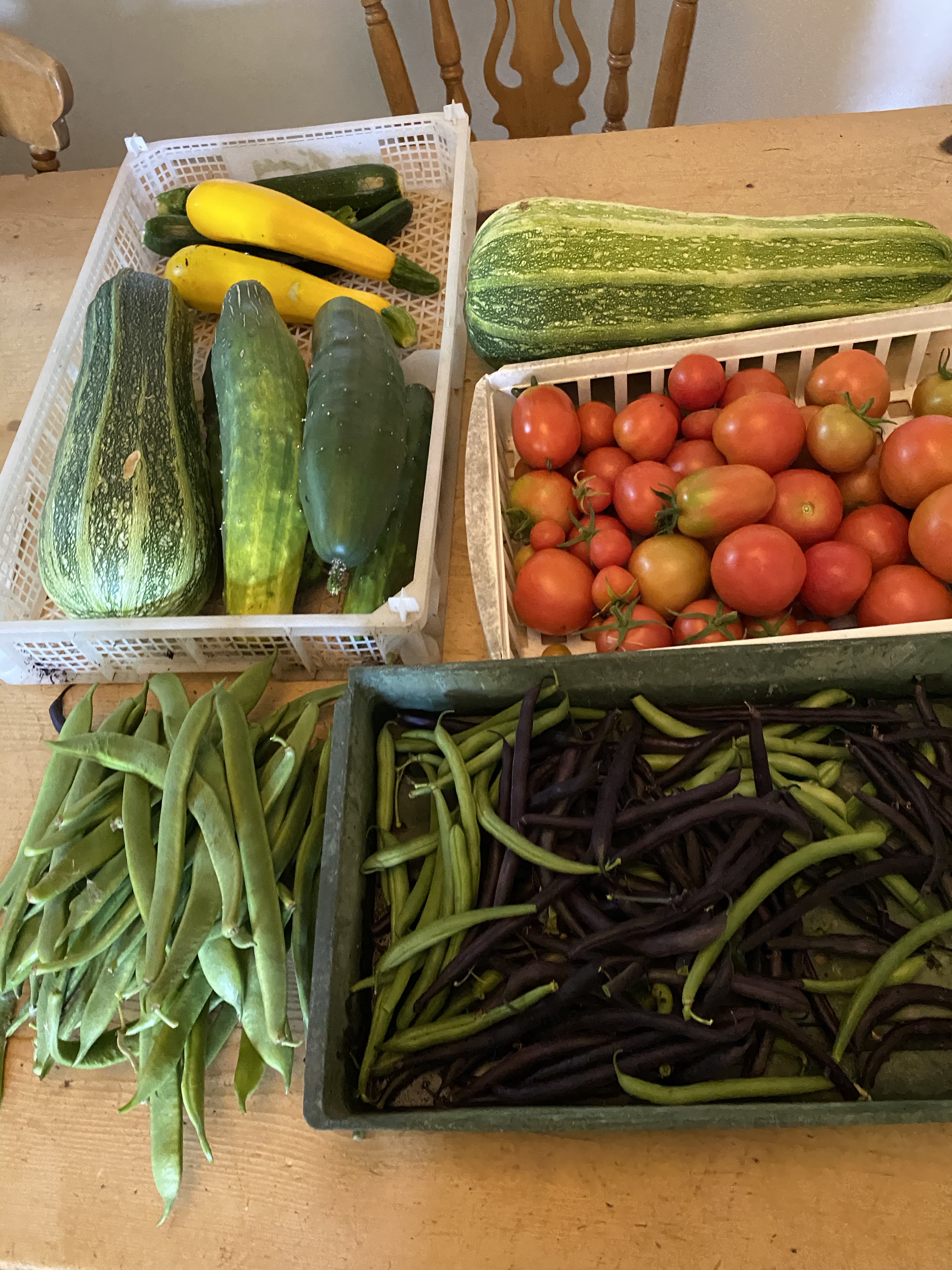 I picked the apples from my eating apple tree, the wasps have started on them and they are beginning to fall so that tells me they are ready and last year I lost the lot to the birds so I was determined to harvest them this year 🤪 and as they will continue to ripen after picking we are all good, I need to get to the pears as soon as possible too. These are not ‘keeper’ apples so they won’t store all winter but they will last a month in the bottom of the fridge, a bit too many for us so I will be giving some of them to Shelley and Sam for the grandchildren 😀 I also picked a fair few cucumbers, more than I thought were out there, some tomatoes and some French beans which have suddenly decided to kick start production.