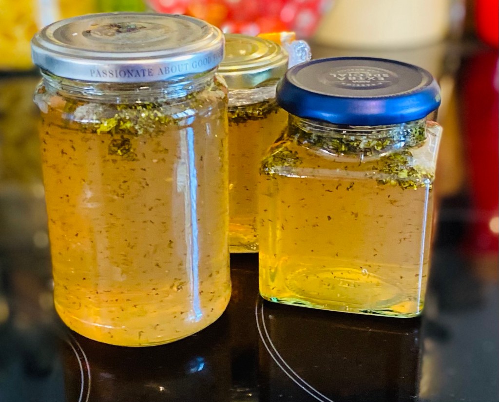 Mint jelly, not quite as clear as I would have liked and I forgot to turn it when it was part set so the mint bits are all at the top but it will still be delicious 😋 The jelly you buy in the shop will have green food colouring added to it to make it more appealing 🙄 this is the colour it actually should be 😀
