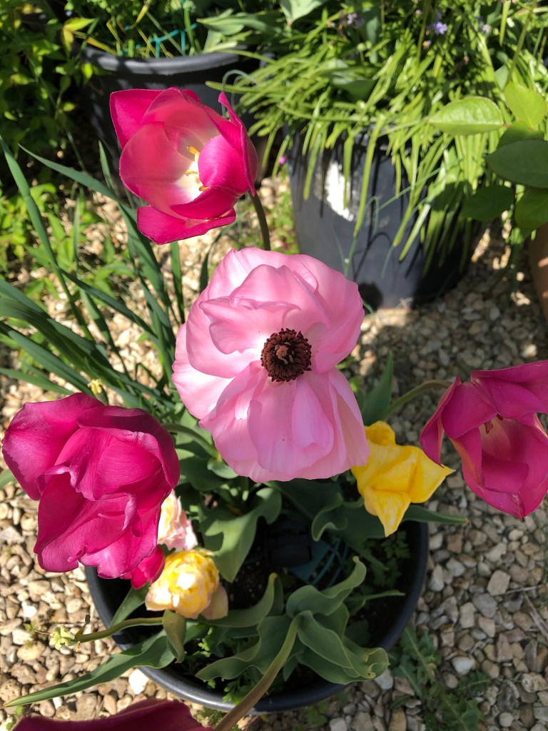 I have taken a few photos of plants I am loving in the garden at the minute, the mighty Angelica which has reached well over 5ft this year a beautifully architectural plant that I put in the tortoise run to give some shelter with the huge leaves. The ranunculus, which is the pink one in with the tulips, I adore these romantic flowers, lovely open blossoms perfect for bees and insects. And then there is the red Maple, again another mood lifting colour which goes particularly well with the clematis behind it, my intention was always to plant this tree in the front paddock but at the moment it’s still in the pot lol.