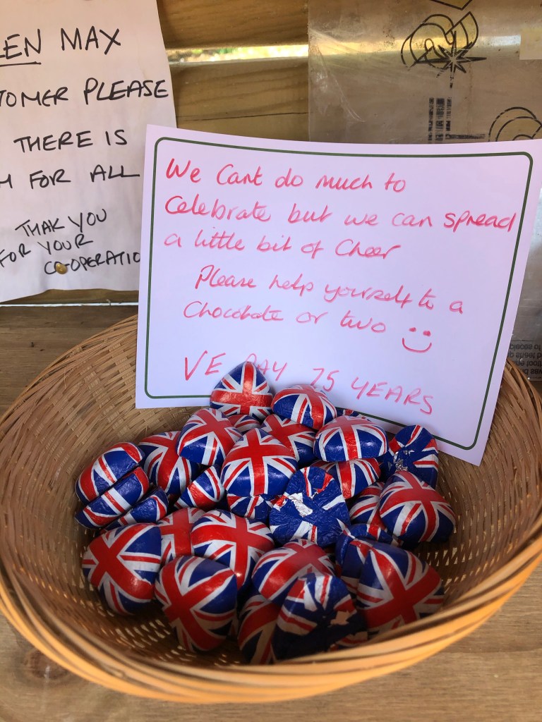 Bank holiday Friday: VE Day 75th anniversary and we all have to celebrate at home 😏 as there wasn’t much point sitting out in our front garden to wave to the occasional passerby, we put up bunting and offered chocolate in the egg shed 😀
