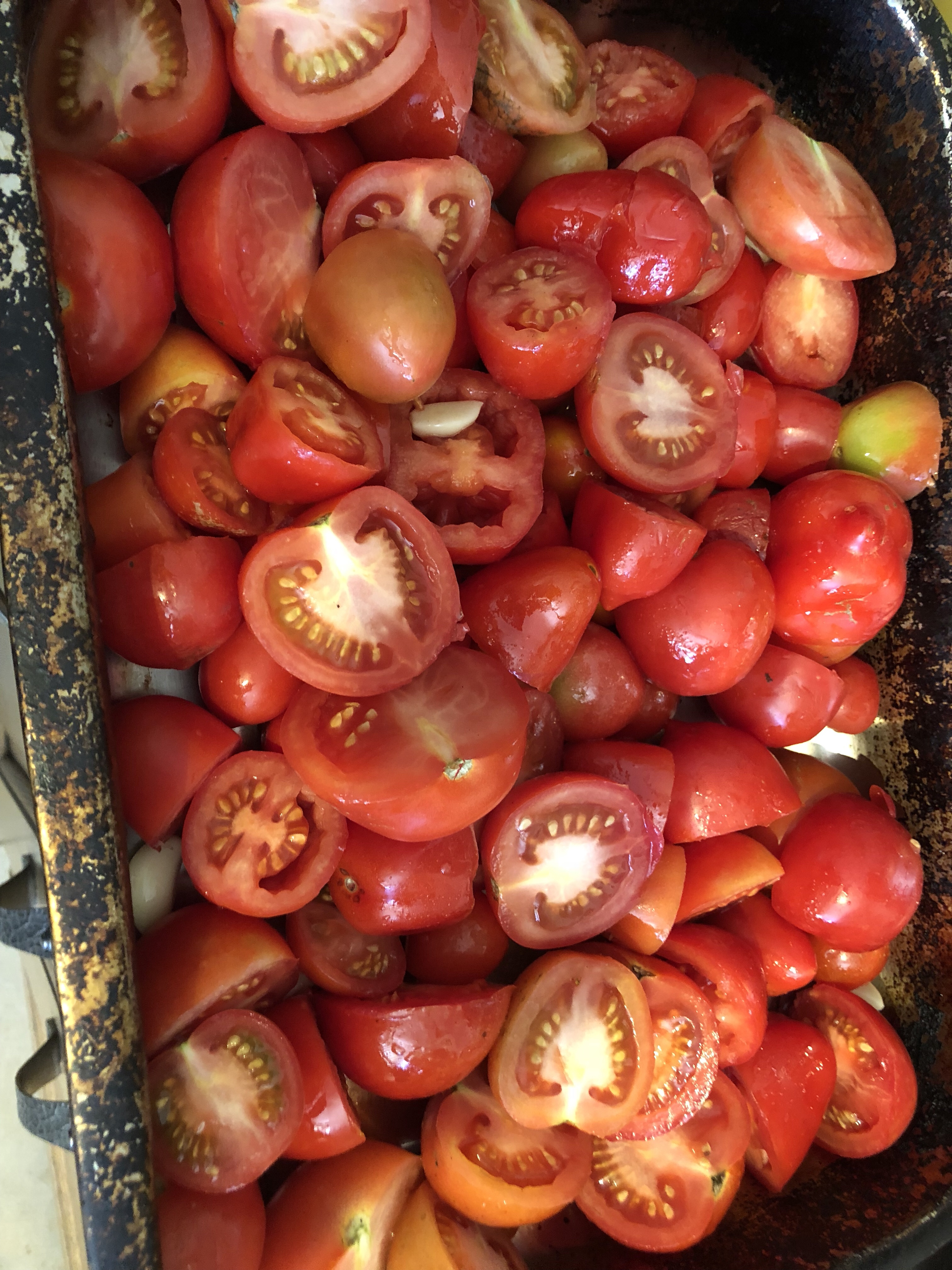 While the oven is cooking bread I might as well make good use of it so I am roasting tomatoes, carrots, garlic, onions, and basil in olive oil and butter, this will probably be the last batch of tomato sauce for the freezer, It’s all chunky or whole as it will be sieved when it’s done.